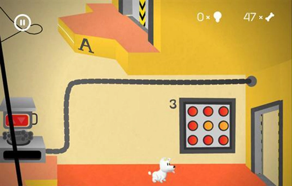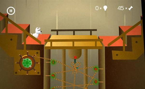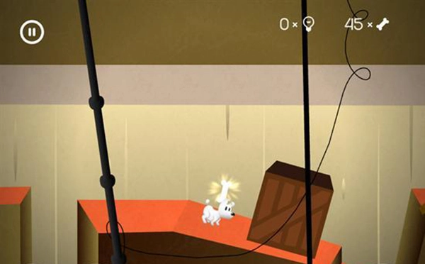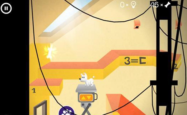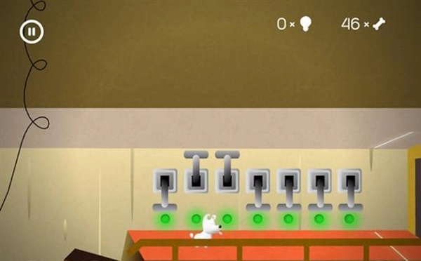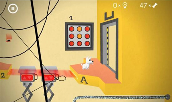 5、进入下个场景的房间后,让mimpi狗狗跳上下图的那个弹簧台阶上,触屏点击一下这个弹簧就可以移动上面。玩家要向左边,就是有骨头的方向条过去