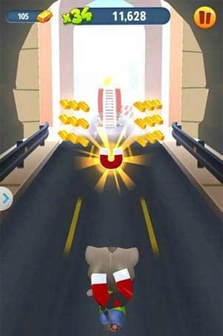 试想一下,如果前方三条路径都有很多金条,无法全部收集岂不可惜?《汤姆猫跑酷》的“磁铁”道具能为你完美解决这个问题~玩家拾取磁铁后,可以在一段时间内将周围所有金条全部“吸”过来。特别是在遭遇满屏金条的情况时,磁铁将在瞬间提升玩家收益。体验过该道具功效的小伙伴,是否会想起令人望而生畏的“吸星大法”呢?无论对方有多么深厚的内力,只要使出此招,便可在顷刻间将其击败。把沿途金条一个不漏尽数收入囊中,想到这满满的成就感就觉得很刺激