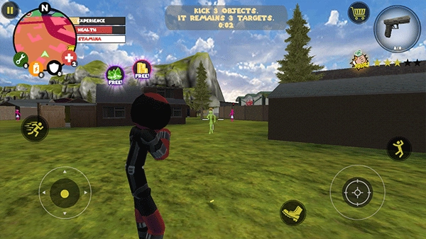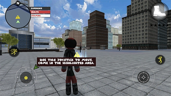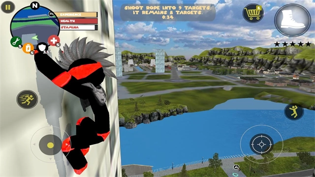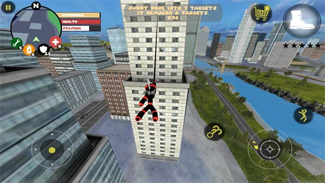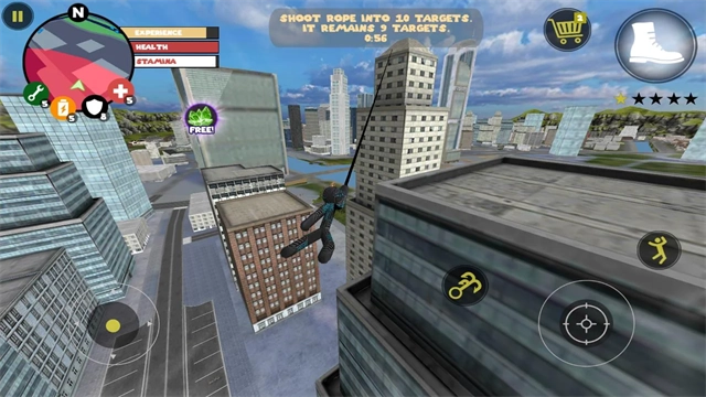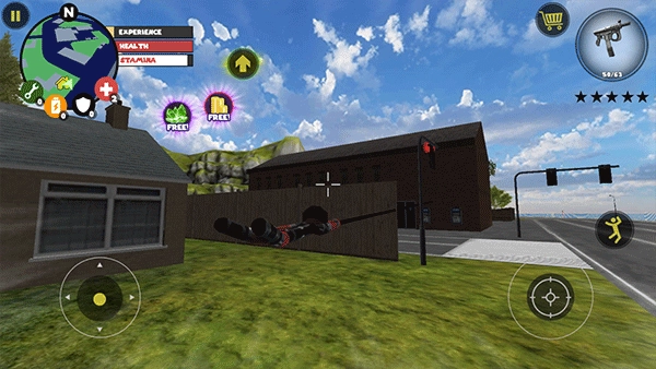 左侧移动、加速,右侧绳索,攻击(跳跃),跳跃,右上侧的武器更换以及血量、经验的显示都实时更新,一览无遗,凭借着大家自由的玩法,与其他帮派的人物进行交火,期间杀人能够获得经验,杀多了会产生星级,警察和其他附近角色会特殊照顾你对你展开火热的进攻,而如何存活,如何将其他人物击杀则是你所需要完成的任务。