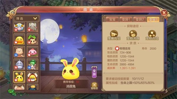 综合说明:在游戏中通过银币就可以购买,携带等级为55级,宠物各方面资质和能力都比较普通,特别是攻击资质比较低,不过这是一只血宠,所以它的优势是加血量,如果角色攻击力比较高,血量相对较少,纯粹为了增加血量的话,55级的血宠汤圆兔绝对是一个不错的选择。