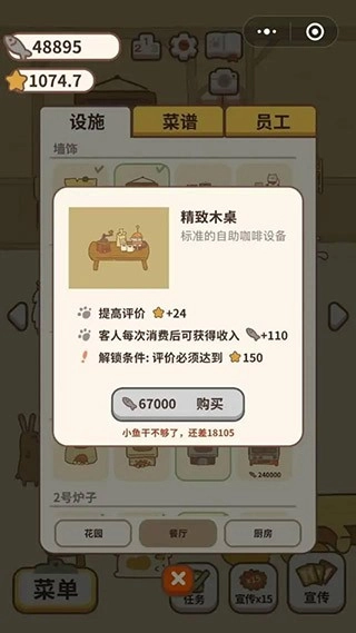 4、关于菜品,建议只要能买就买。这是由于部分动物需玩家解锁菜品之后才会现身。也就是说,解锁菜品等同于解锁新动物,如此便能完成成就。