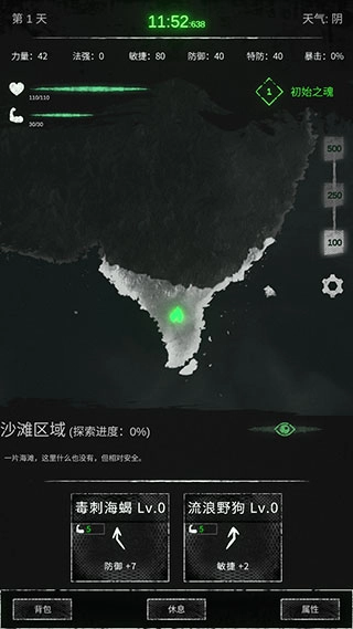 每次探索都会有不同事件出线,探索事件会消耗体力,探索可以获取到食物、道具、技能或者剧情。当体力消耗完后休息会重新恢复体力值;