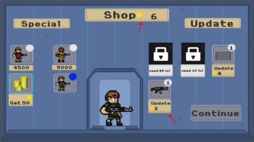 4、当获取到对应的金币后,便可点击屏幕右上方的“Shop”,用于购买道具以及人物角色,完成后点击“Continue”,接着继续射击僵尸。