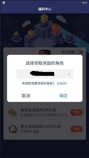 3. 点击“领取”后,系统会提示你选择游戏角色,确认无误后,点击【确定】即可。