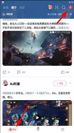 1.首先要进入【圈子】,接着点击右上角的加号按钮。
