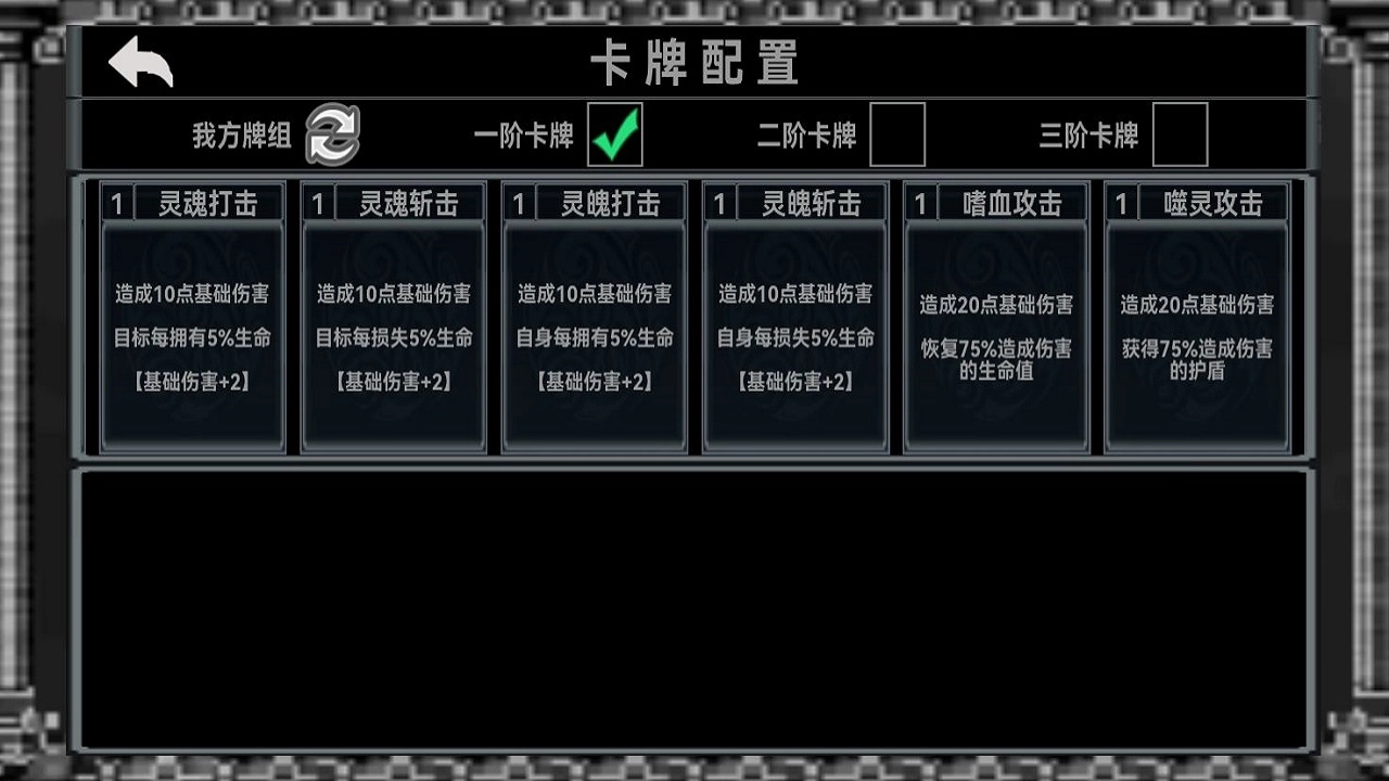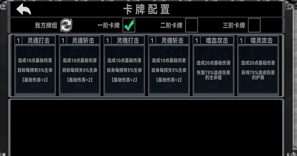 -就比如有灵魂类型的卡牌,大家需要选这类型的卡牌,因为同类型卡牌效果是相同的,很多buff都可以互吃,之后就可以组建出一套比较强力的卡组了,卡组组建后就可以开始战斗了,而在战斗的时候大家还需要注意一点。
