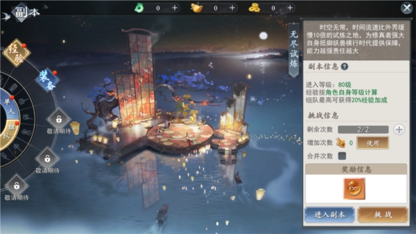 接着,重中之重当属无尽试练,这是一个组队参与的经验副本,只要成功通关,就能获取大量经验。千万别忘了佩戴守护,并且使用经验药水,如此一来,快速升级便不再只是梦想!