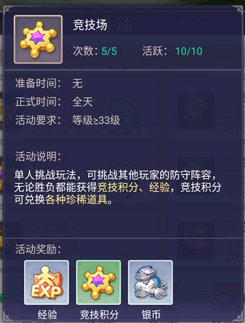 每日有五场机会,挑战其他玩家的防守阵容,能收获大量经验、竞技积分与银币。经验和银币是游戏中不可或缺的部分,而竞技积分可用来兑换大袋金币。