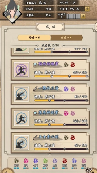 分析:除了玄铁剑法和九阴真经,其余的都是容易获取的武学,获取流程顺畅,基本无需过多思考。前期依靠黯然销魂掌作为主力,到了大后期则更换为玄铁剑法。