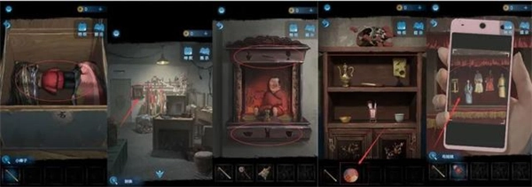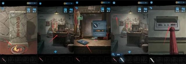 5、轻触门板,使用朱砂笔把门上图案一笔连贯勾勒出来;走进第三间屋子,点击小木桌,拿到小木棍,同时获取鼓锣敲击的顺序。先把封条放置在木箱之上,接着点击红布,将红布拉下。按照获取的顺序敲锣打鼓,即可开启木箱。