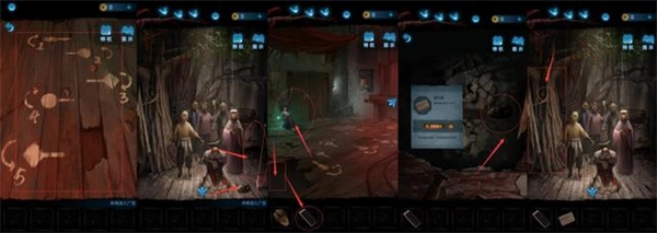 2、把树洞中的小人拿走,用图钉把白布挂起来,再用手机敲击使其固定。接着走进树门,来到第三间,依据大厅地板的线索拨动帽翅,带有钥匙的陶人便会现身。