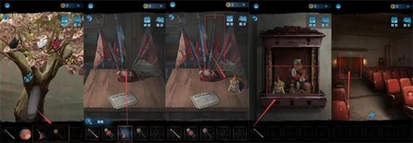 2、首先点击灭火器,接着点击着火的假花以完成灭火操作;然后点击纸伞蝴蝶,从而拿到道具;之后把玉蝴蝶放置到石碑上的凹槽处,获取线索;最后点击墙上的三个圆盘,将它们调整到正确的方向,进而拿到绣花鞋。