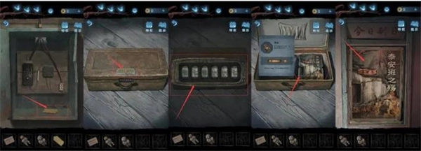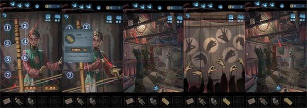6、顺着放下的梯子登上第四间,点击墙上的报纸,得到第二间梁少平木偶人姿势的线索。接着回到第三间,翻看木架上的书籍,获取操控木偶具体肢体对应的孔位。然后点击操控板左边2、3、4、5孔位的线以及右边1孔位的线。之后再回到第二间,点击并拿走地上的琴弓和木盒。注意木盒上还有第二个小人,要取下来。