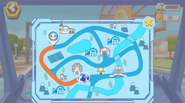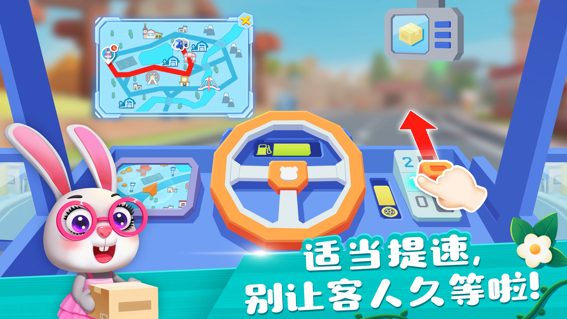 2、[驾驶卡车的交货单] 叮铃,客户下达了一份送货订单。宝宝迅速驾驶着货车,依照地图导航,准时将货物送到了小镇客户那里。
