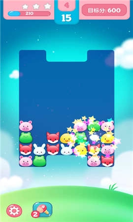 2、于关卡界面,通过使3个及以上相同小动物达成匹配,实现消除,以此积累分数,向目标分发起冲击。