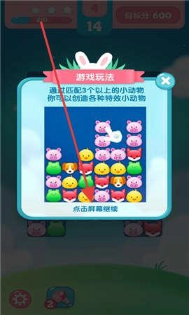 3、要是对玩法有疑问,点击“点击屏幕继续”,查看诸如“通过匹配3个以上小动物造特效”之类的规则,帮助你顺利闯关。