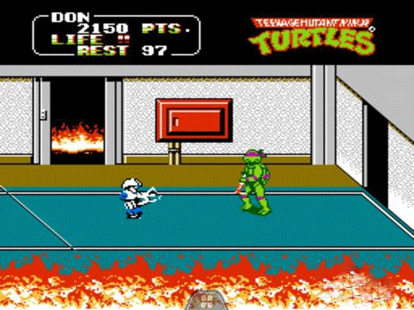 过关技巧:可以站在boss旁边然后使用普通攻击,boss在被攻击时不会攻击忍者龟,不过要注意躲避boss的子弹,一般失去两条性命就可以过关了。