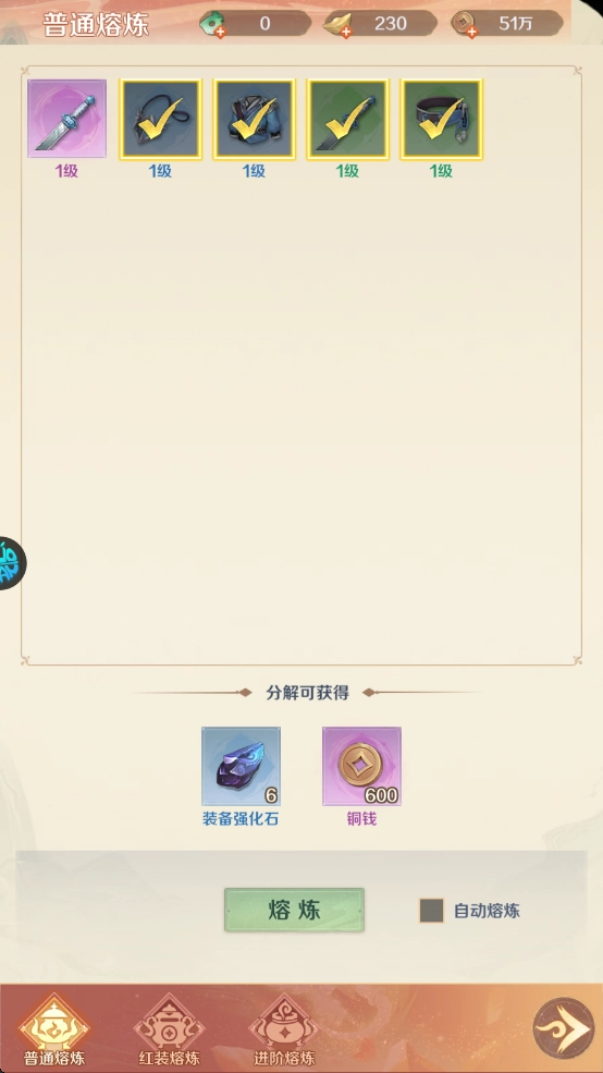 3、若低品阶装备数量过多,可一键熔炼,获取装备强化石与铜钱。