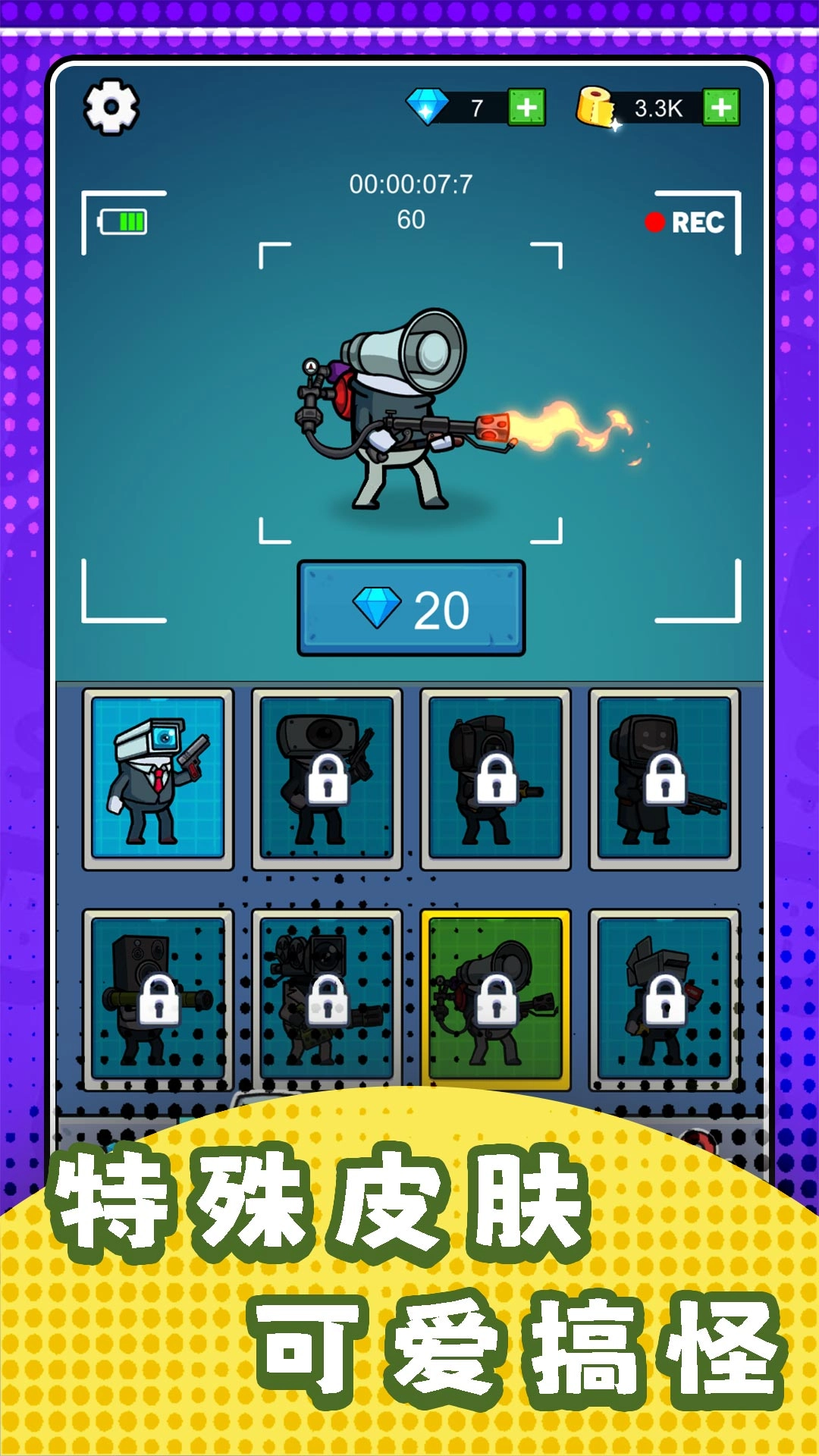 1. 玩家操纵角色向马桶头敌人开枪射击,同时躲避敌人攻击,完成关卡所布置的任务,进而获取金币、钻石等资源。
