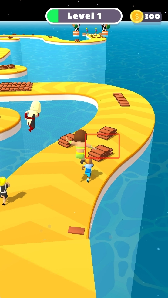 2、在奔跑过程中,会碰到红框所标注的砖块堆,此时我们要操控角色靠近并拾取,通过收集这些建筑材料来助力通关。