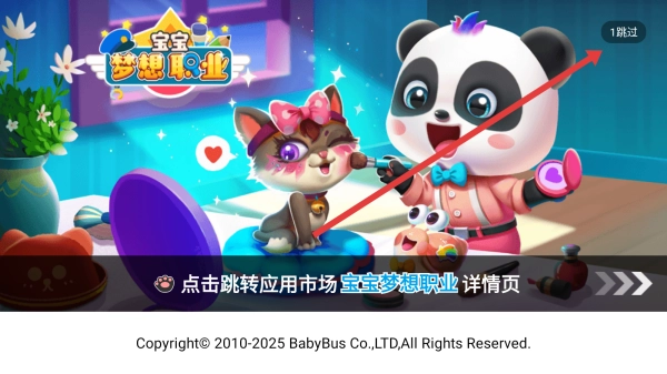 1. 在《宝宝梦想职业》的启动页面,点击【1跳过】选项,即可略过开场动画,迅速进入游戏主界面。