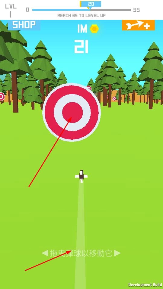 2. 在射击过程中,通过拖动弹球来调整箭矢的飞行轨迹,力求精准命中靶心区域,从而累计分数,例如21分。同时,要留意上方的等级进度条,当进度达到35时即可实现升级,进而推进关卡。
