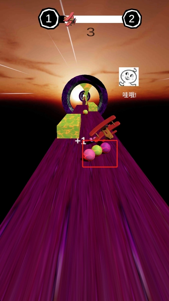 1. 顺着紫色轨道前进,当看到红色飞机道具时,要及时点击获取。利用它的特殊效果,来应对轨道上出现的各种障碍与变化。