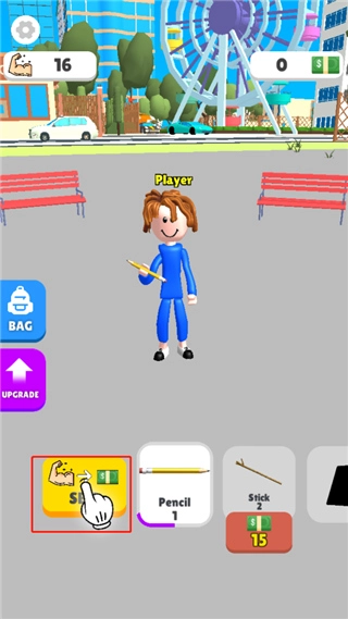 2、进入后,角色举起的是铅笔,每举一次肌肉增加1。