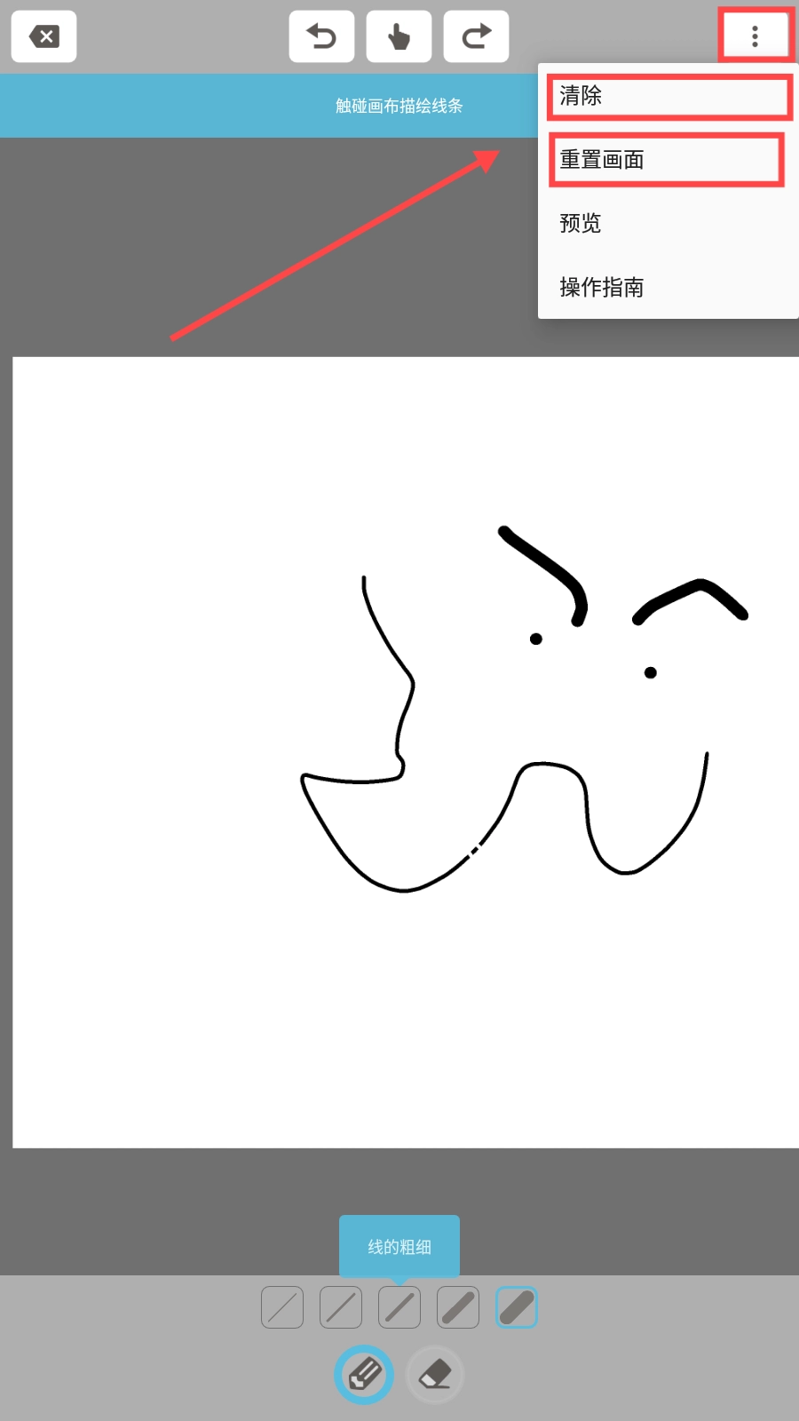 2. 在进行画稿编辑时,点击右上角的三点菜单,从中选择【清除】或者【重置画面】,就能快速修正画错的部分。