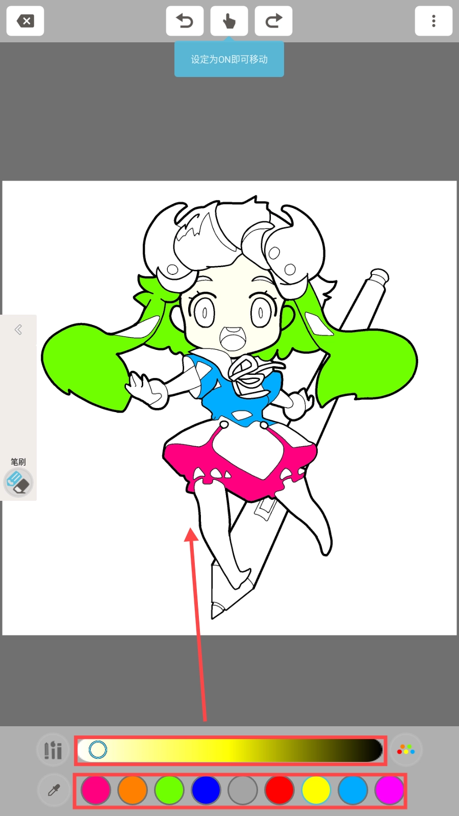 3、进入填色界面,在底部挑选颜色,接着对渐变条进行调整,从而为线稿角色上色,使画作呈现出更加绚丽夺目的效果。