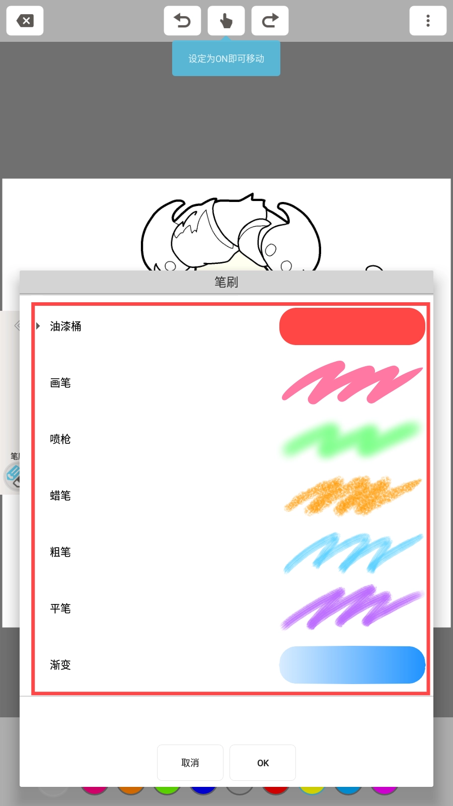 4、轻点左侧的笔刷按钮,笔刷栏便会开启。从中挑选【油漆桶】【喷枪】等笔刷,借助它们辅助创作,让效果更加丰富多样,如此一来,你的画作就能轻松脱颖而出啦。