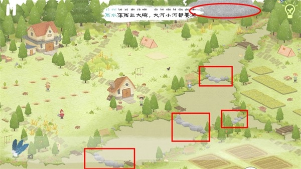 5、雨水要来啦!点击乌云使其降雨,之后点击石堆,石堆总共有四处,一处都别落下哦~等小河被雨水填满,就能进行下一步咯。
