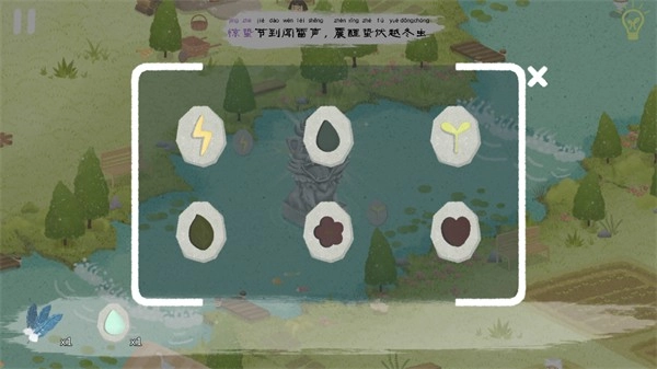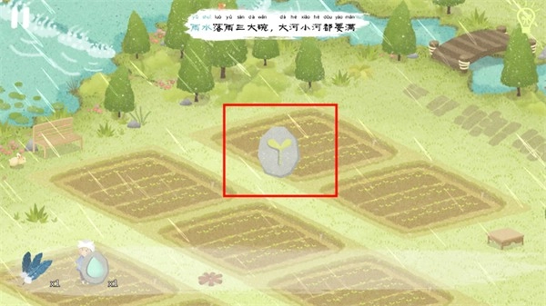 待所有河流都被注满之时,河边的老妇人激动地跃入河中,点击老妇人身旁就能获取“水滴石板”。在倾盆大雨之下,田地上方同样能够得到嫩芽石板。