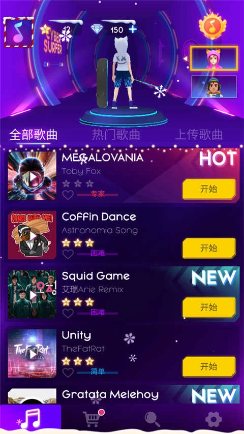 7、回到主页面,在“全部歌曲”“热门歌曲”“上传歌曲”中挑选,随心选择你最钟情的旋律开启挑战。