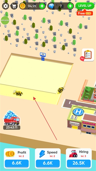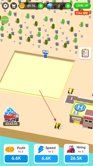 1. 打开游戏,留意屏幕上方显示的金币数量,例如89.7K,接着点击屏幕下方的Hiring按钮,消耗金币来雇佣推土机。