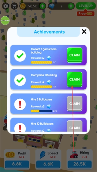 4、当完成诸如“Collect1gemsfrombuilding”这类特定任务后,在“Achievements”界面中点击“CLAIM”即可领取奖励,以此加速游戏发展。