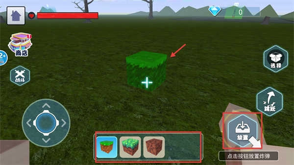 3、当切换至建造模式后,从下方的方块栏中挑选好方块,接着点击右侧的【放置】按钮,如此便能够在场景中布置方块了。