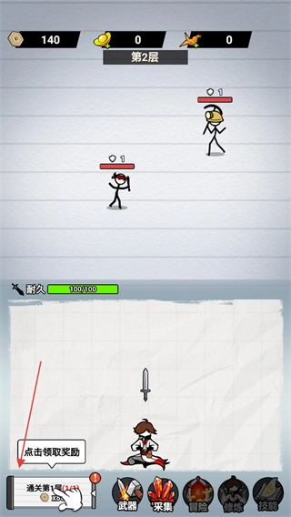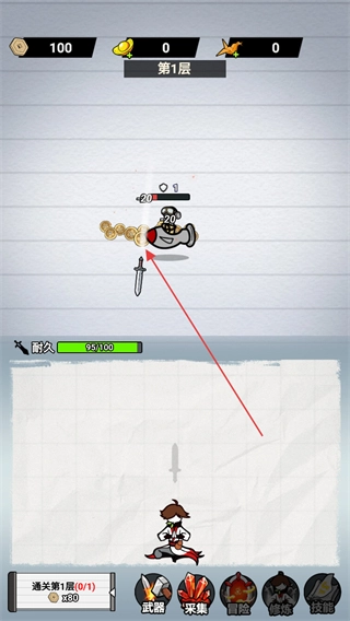 1. 开启游戏后,留意到屏幕上方呈现第1层字样,此时操控游戏角色挥剑向敌人发起攻击,成功打败敌人后便可获得金币。