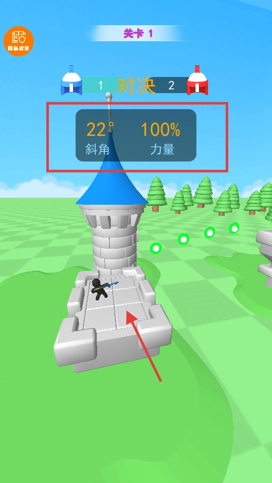 3、进行射箭操作时,重点留意【22°】的斜角以及【100%】的力量,并依据绿色轨迹点,精确地对射击参数作出调整。
