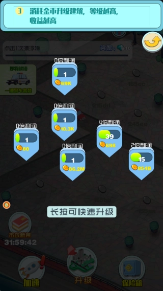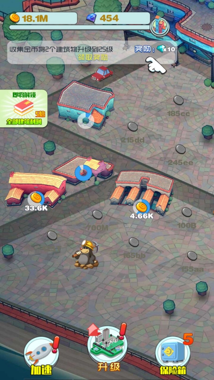 2. 所收集的金币能够用来升级建筑以及解锁全新设施。当等级逐步提升后,每一栋建筑带来的收益会显著增长,此时玩家就能够借助这些金币,进一步打造城市建筑。