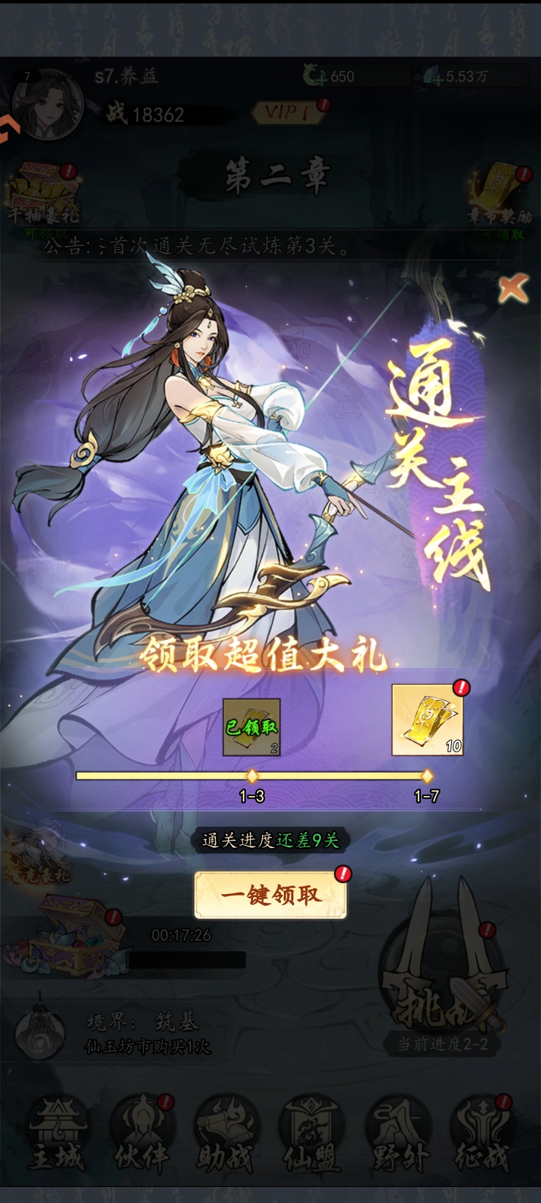快速开启关键功能:前期要率先完成新手引导任务,迅速推进关卡以提升收益,进而解锁飞升之路、伙伴、仙盟、野外试炼等核心系统。