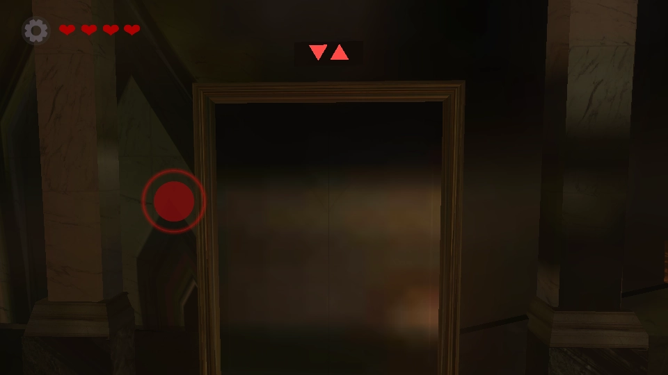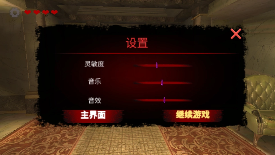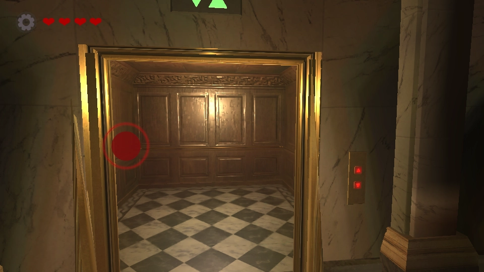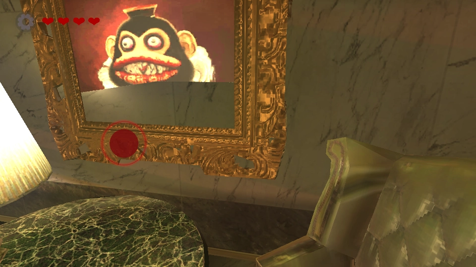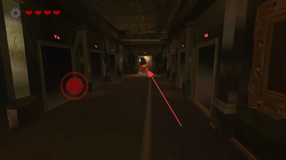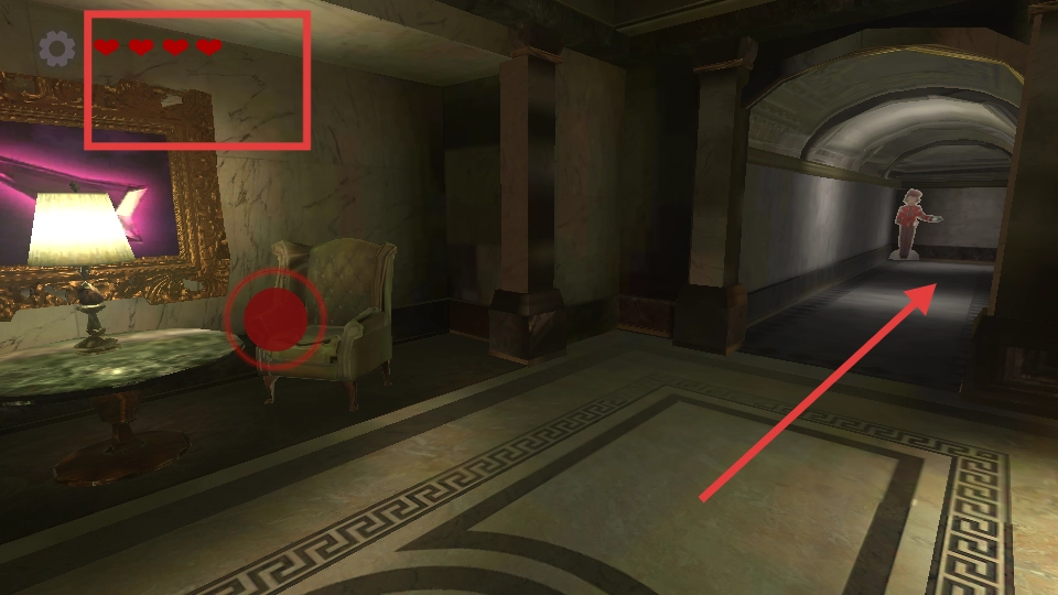 3、注意左上角呈爱心形状的血量显示,朝着走廊远处角色所在方向移动,与此同时,留意观察周围能够互动的场景元素。