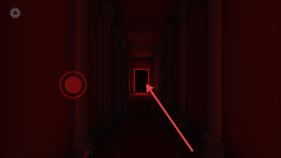 2、于红色调的走廊场景里,向着前方发光的门前行,对未知区域展开探索,留意场景中的环境细节。