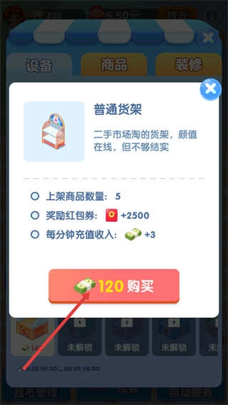 3、能够购买货架,像普通货架,支付相应货币即可购入。货架可以陈列一定数量的商品,同时还会带来诸如券和收入之类的奖励。