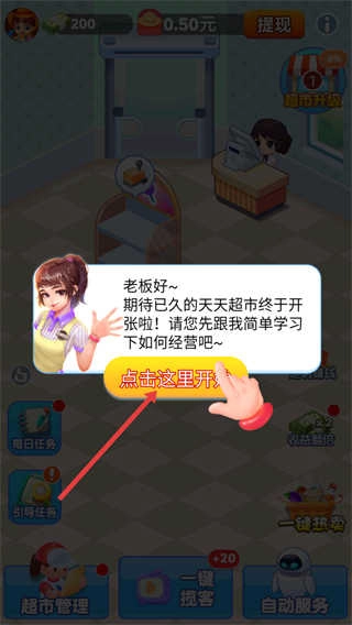 1会出现引导提示,点击“开始”,依照引导学习超市经营方法,踏上超市经营之旅,为后续经营做好铺垫。