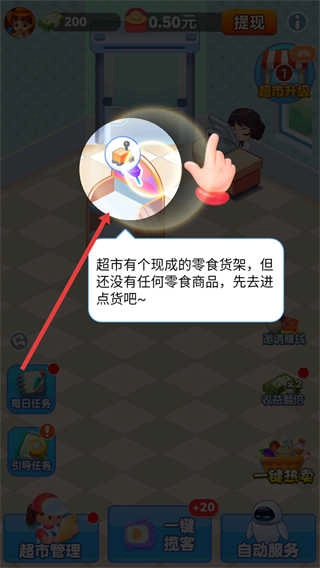 2、超市设有现成的零食货架,然而架上并无零食商品。需依据提示进行进货操作,以此丰富超市的商品种类,使货架上有可供售卖的零食。