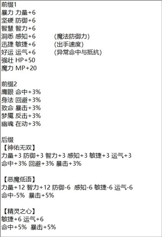 2. 包含鹰眼、强壮、洞悉、迅捷、智慧、坚硬、好运、致命、幽魂、身法,还有恶魔(稀有词条)、神佑(稀有词条)、精灵(稀有词条)