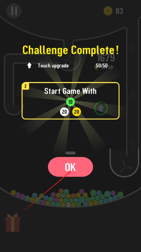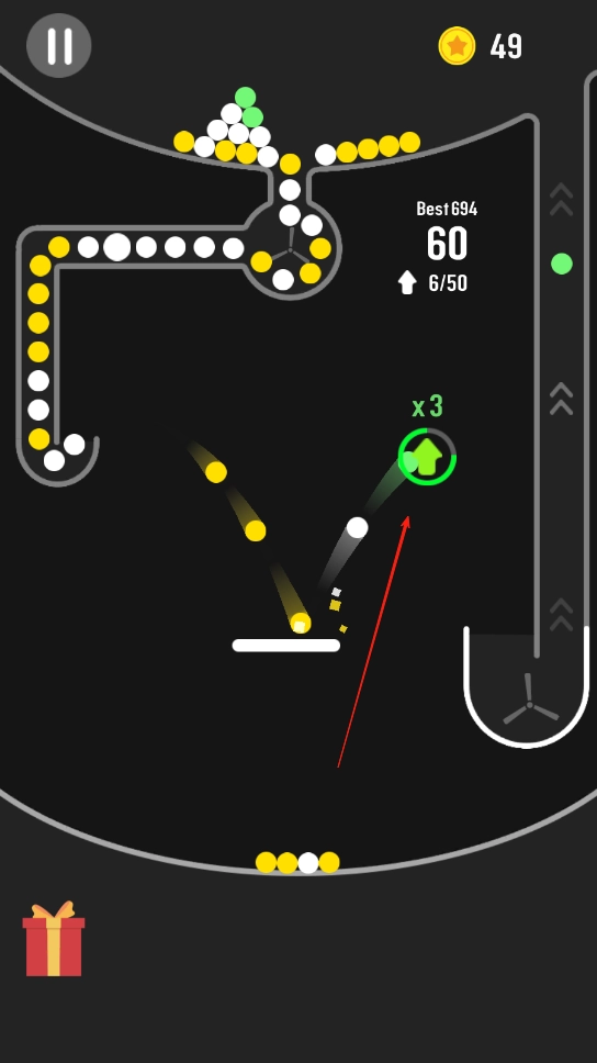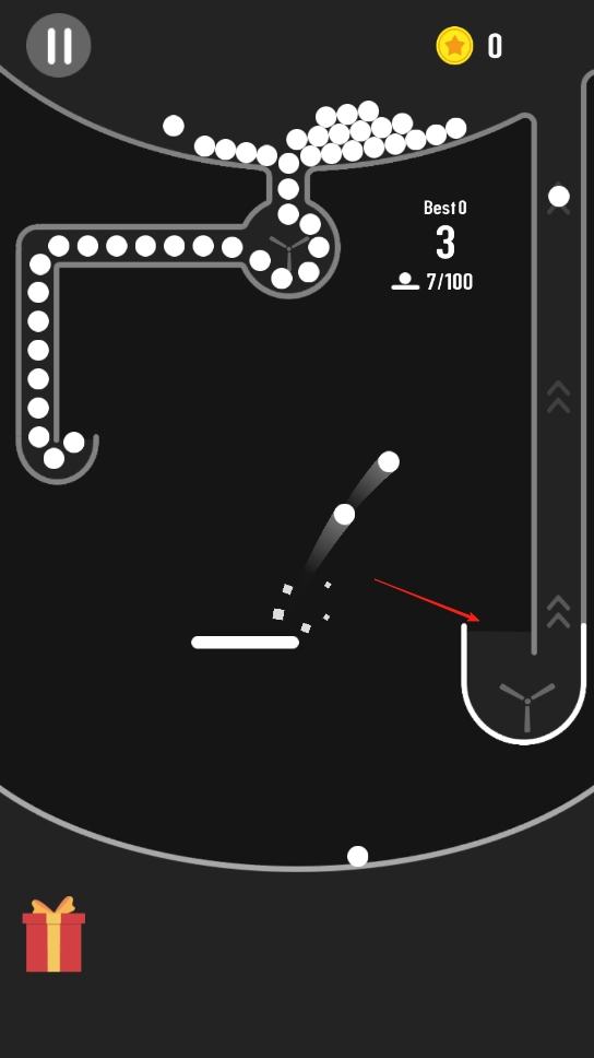 3、不断使小球在循环内反弹,防止其掉落出规定区域。当小球顺利完成数次循环且积累到一定分数时,就能通过当前关卡,进而解锁难度更高的新关卡。