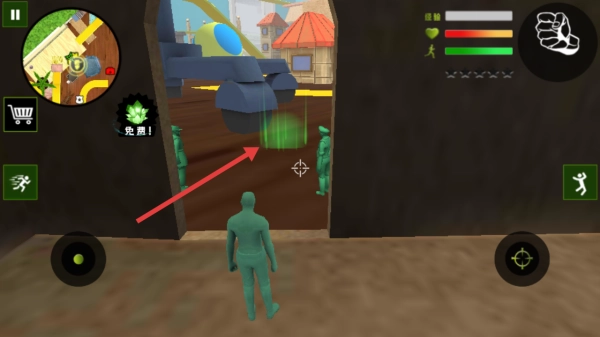 2. 在游戏中,依照箭头的指引前行,逐步靠近目标区域,找到绿色互动点,通过完成任务交互,推动玩具兵的生存流程。
