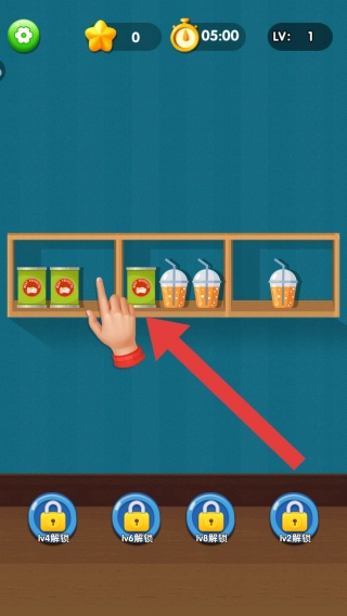 1. 按照提示,把货架上的饮料罐与饮料杯归置到同一个货架格,达成关卡目标。此外,下方还有如V4解锁等有待解锁的关卡。